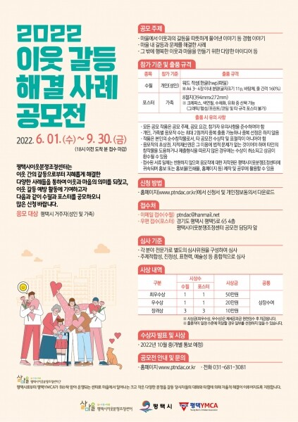 응모 대상은 평택시에 등록된 거주자로 한정했으며 이웃분쟁조정센터 누리집에서 신청서 및 개인정보동의서를 내려받아 제출하면 된다.