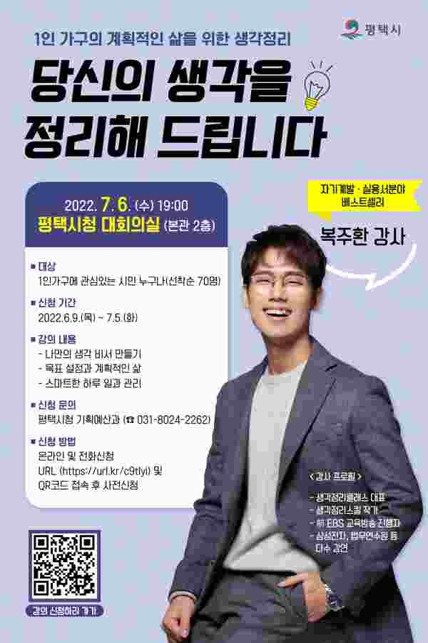 이번 강연은 생각정리전문가 복주환 강사의 ‘1인가구의 계획적인 삶을 위한 생각정리 스킬’이라는 주제로 1인가구의 균형 잡힌 라이프 스타일을 만들고 스마트한 삶을 설계하는데 도움이 되고자 기획됐다.