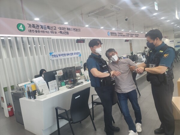 이번 모의훈련은 민원상담 도중 민원인이 공무원에게 폭언과 폭행 등 위협상황 시 상황별 대응 요령 매뉴얼에 따른 대응반 운영과 안심벨 정상 작동 여부 등을 점검하기 위해 실제상황으로 연출했다.