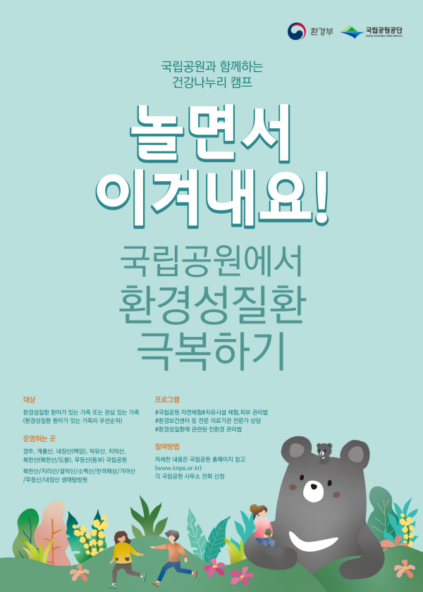 박용규 환경부 환경보건국장은 “건강나누리 캠프에 참가하는 환경성질환을 앓고 있는 어린이와 가족들의 만족도를 높이기 위해 이번에 다양한 국립공원 자연환경 체험 과정과 깊이 있는 환경성질환 예방 강의 등을 준비했다”며 “앞으로 민감·취약계층의 건강보호를 위해 건강나누리 캠프와 같은 환경보건 복지 사업을 적극 발굴하고 확대해 나가겠다”고 밝혔다.