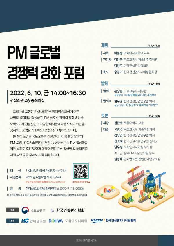 국토교통부 김영국 기술안전정책관은 “정부는 공공공사에서도 PM이 활성화될 수 있도록 추진할 계획이며 공공공사 외에도 민간공사, 해외시장까지 국내 PM 기업들이 진출해나갈 수 있도록 적극적으로 노력할 것”이며 “이번 포럼은 업계와의 소통을 기반으로 PM 산업을 육성해 나가겠다는 정책적 의지를 보여주는 것으로 앞으로도 업계와 국민들이 공감할 수 있는 정책을 추진해나가겠다”고 밝혔다.