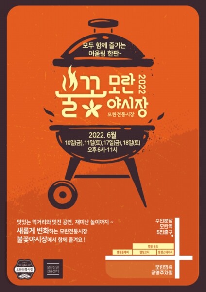 이 기간, 오후 6시부터 밤 11시까지 모란시장 사거리 200여m 구간에 바비큐, 닭꼬치, 고기전, 낙지호롱구이 등 25개 매대가 설치돼 불야성을 이룬다.