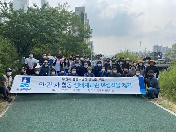 수원시가 주관한 ‘생물다양성 보전을 위한 생태계교란 야생식물 제거’ 활동에는 공직자와 수원하천유역네트워크 회원, 삼성전자 직원, 원천동 주민 등 100여명이 참여해 가시박, 환삼덩굴, 단충잎돼지풀 등을 제거했다.