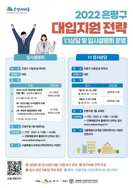 김미경 은평구청장은 “수험생·학부모에게 양질의 공교육 기반 입시 프로그램을 통해 급변하는 입시정보를 적기에 제공하길 바란다”며 “학생들의 진로진학 탐색 역량을 길러주는 유익한 시간이 되길 기대한다”고 전했다.