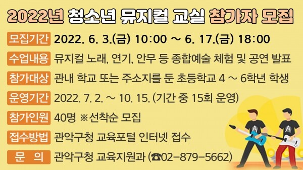 프로그램은 총 15회 과정으로 오는 7월부터 매주 토요일 오후 1시 ~ 오후 3시 30분까지 관악구 평생학습관에서 진행되며 전문 연출가의 지도 아래 뮤지컬 노래, 연기, 안무 등 종합 예술 체험으로 이뤄진다.