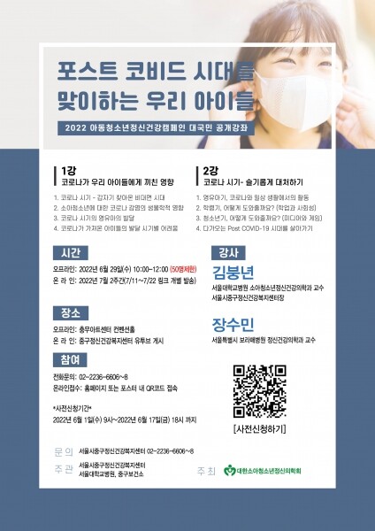 이어 서울보라매병원 정신건강의학과 장수민 교수가 진행하는 '코로나 시기-슬기롭게 대처하기'에서는 소아청소년의 정신건강을 위한 발달단계별 과업과 부모의 역할 등 코로나 이후 시대를 건강하게 살아가기 위한 전문가의 식견을 나눈다.