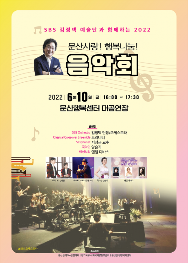 이번 음악회는 문산읍 지역 주민들에게 문화공연나눔을 통한 소통의 장을 마련하기 위해 기획됐으며 SBS 오케스트라, 트리니티, 슬기, 엔젤디바 등이 출연해 약 90분간 진행된다.