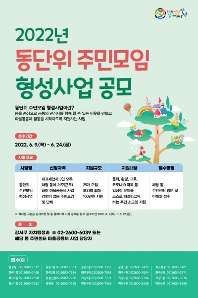 신청기간은 오는 24일까지이며 사업제안서 사업계획서 사업 참여자 명단 등 신청서식을 작성해 해당 동 주민센터를 방문하거나 동별 담당자에게 전자우편으로 제출하면 된다.