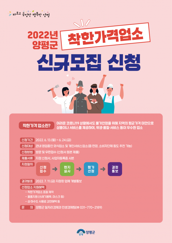 신규모집 대상은 한식, 중식, 일식 등 외식업분야와 세탁소, 이·미용, 목욕업 등 개인서비스 업종으로 신청은 군청 홈페이지에서는 신청서를 다운받아 작성해 제출하거나, 읍·면장 또는 소비자단체에서의 추천도 가능하다.