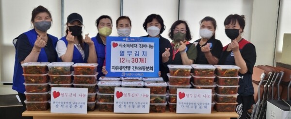 한국자유총연맹 간석4동 분회 회원들이 직접 구입하고 담근 열무김치는 지역 내 저소득 가구 30세대에 전달됐다.