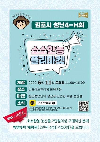 ‘소소한농 플리마켓’은 김포시의 청년농업인으로 구성된 김포시4-H회 회원들이 생산한 신선한 농산물과 가공품을 판매하는 장터로 직접 생산한 버섯, 흑미 등 고품질 농산물과 청년이 그린 피자와 김포 유과 등 정성껏 만든 다양한 농가공품들이 판매될 예정이다.