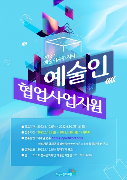 이번 사업에 대한 세부적인 사항은 화성시문화재단 홈페이지 알림마당 ’ 공고를 통해 확인 또는 화성시문화재단 예술인지원팀으로 문의하면 된다.