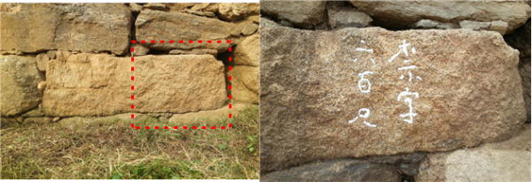 군현 각자 : 지방 군현의 명칭을 새긴 각자로 성벽이 무너지거나 문제가 생길 시 그 구간을 축성한 지역 담당자에게 책임을 물었다.