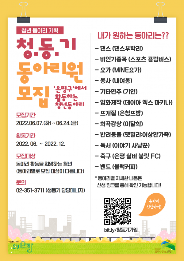 ‘청동기’사업에 참여하는 동아리는 댄스, 비인기 운동종목, 요가, 봉사, 기타연주, 영화제작, 뜨개질, 희곡 감상, 반려동물 커뮤니티, 독서 축구, 밴드 등 12개 동아리이며 올해 말까지 은평구 지역을 중심으로 활발한 활동을 하게 된다.