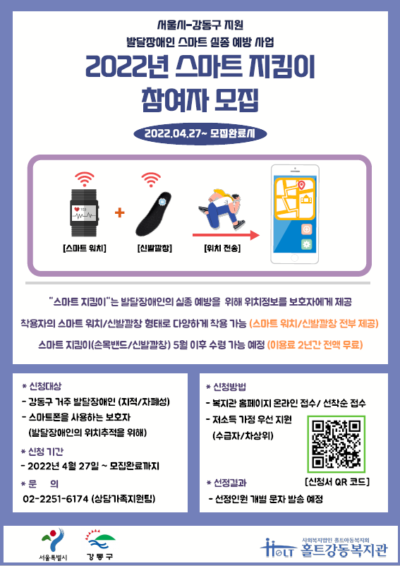 이정훈 강동구청장은 “스마트 기술을 활용한 기기 지원으로 발달장애인의 사고 및 실종을 예방할 수 있는 사업”이라며 “발달장애인 가정에 심리적 안정감을 도모해 발달장애인이 안전하게 살 수 있는 강동이 되도록 힘쓰겠다”고 전했다.