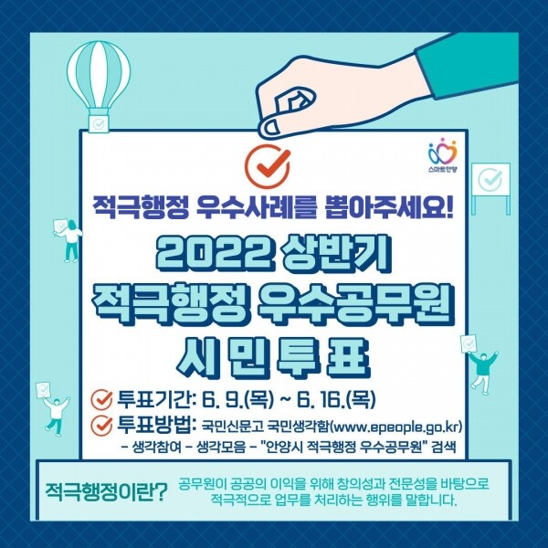 최대호 안양시장은“우리시는 매년 적극행정 우수공무원을 자체 심사를 통해 선정해왔다 이번 시민투표는 적극행정 선정에 더욱 공정성을 기하고 공감대를 형성하는 계기가 될 것이다 아울러 공직사회 작은 개혁의 기회로도 삼겠다”며 시민들의 참여를 권장했다.