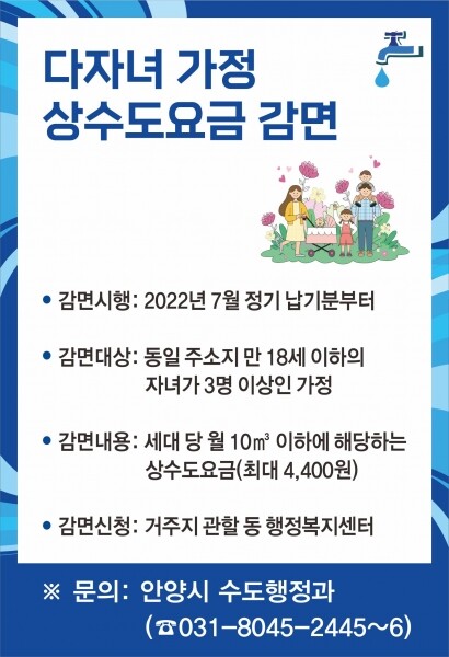 안양시가 출산장려를 위해 상수도요금 감면을 다자녀 가정으로 확대해 7월부터 시행한다고 13일 밝혔다.