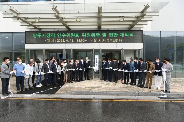 이날 현판식은 강수현 양주시장 당선인과 김상헌 인수위원장, 김시갑 부위원장, 김종석 양주시장 권한대행, 안기영 국민의힘 양주시 당협위원장, 분과별 인수위원, 자문위원 등이 참석한 가운데 인수위원 위촉장 수여, 당선인과 인수위원장, 자문위원장 인사말, 현판제막, 다과회 순으로 진행됐다.