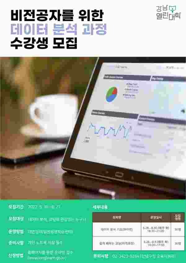모집 기간은 27일까지로 데이터 분석과 코딩에 관심 있는 학습자라면 누구나 강남평생학습 홈페이지에서 신청할 수 있다.