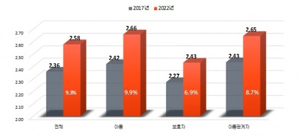 조사 결과 아동친화도 6가지 영역의 전체 평균 점수는 3점 척도 기준 2.58점이 나왔으며 2017년 조사 당시 2.36점 대비 만족도가 약 9.3% 상승한 것으로 나타났다.
