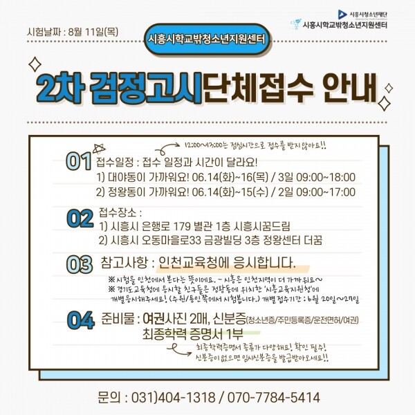 오는 8월 11일에 열리는 제2차 검정고시 응시를 앞두고 진행되는 이번 단체 접수는 검정고시 대비반 참여와 관계없이, 시흥 지역의 모든 학교 밖 청소년들이 접수할 수 있다.