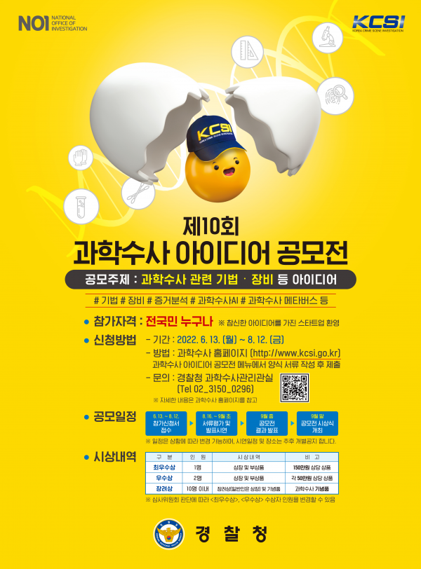 공모전 주제는 과학수사에 적용할 수 있는 새로운 기법·장비 또는 과학수사 발전에 이바지할 수 있는 참신한 아이디어로 8월 12일까지 경찰청 과학수사 누리집을 통해 신청할 수 있다.
