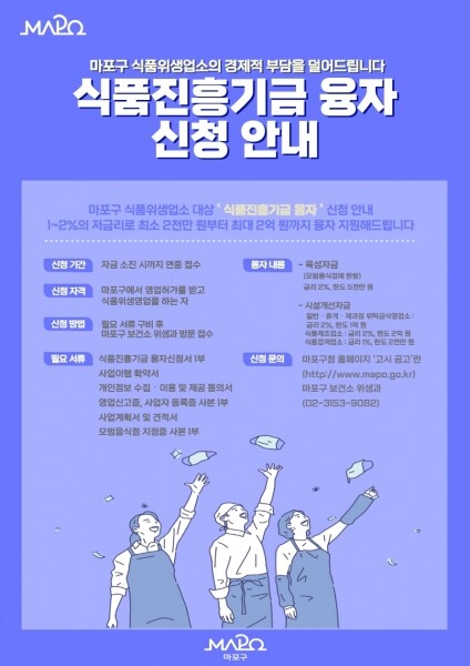 융자 대상자는 일반·휴게 음식점, 제과점, 위탁급식영업, 식품제조업소 등 마포구에서 영업허가를 받고 식품위생영업을 하는 자이다.