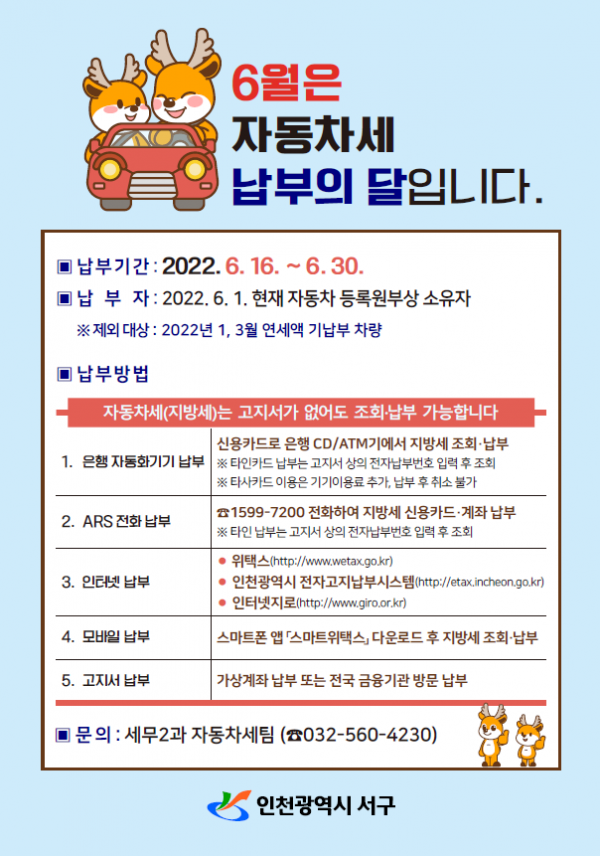 인천 서구는 2022년 6월 제1기분 자동차세 17만 2,896건, 총 193억 9,900만원을 부과하고 납부 방법 안내에 적극 나섰다.
