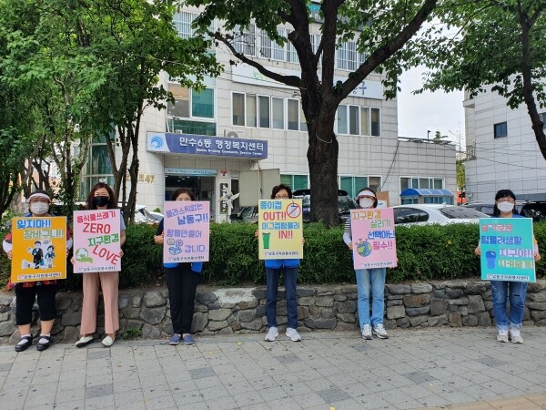만수6동 스마일봉사단 회원 6명은 일회용품 사용 자제, 머그컵 텀블러 사용하기, 장바구니 사용 등 누구나 일상생활 속에서 실천할 수 있는 환경보호 실천 방법을 홍보했다.