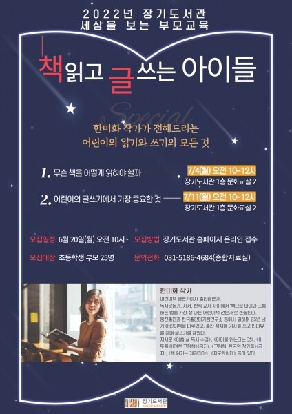 ‘세상을 보는 부모교육-책읽고 글쓰는 아이들’ 강연은 장기도서관의 연간 부모교육 시리즈 중 7월의 강연으로 초등학생의 읽기, 쓰기에 대한 부모들의 고민과 불안을 덜어주고 자녀와 함께 읽기와 쓰기를 실천하는 방법을 찾는 강연이다.