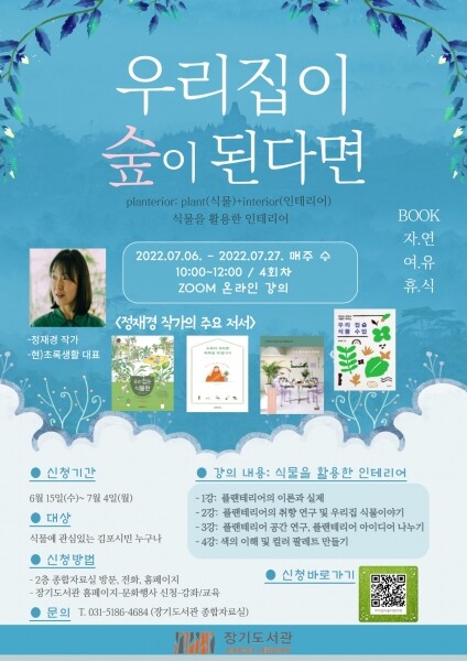 이번 강연은 ‘우리 집 식물 수업’, ‘우리 집은 식물원’, ‘우리 집이 숲이 된다면’, ‘초록이 가득한 하루를 보냅니다’ 저자 정재경 작가가 진행한다.