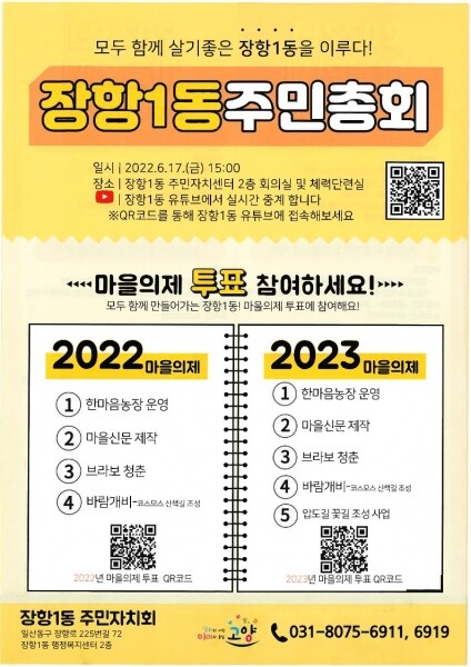 이날 주민총회에서는 2022년 및 2023년 장항1동 주민자치회에서 추진할 마을사업을 연이어 결정할 예정이다.