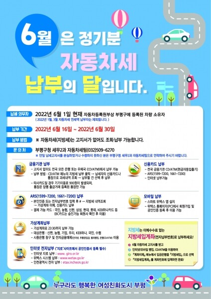 이번 정기분 자동차세 납부대상은 6월 1일 기준 자동차등록원부상 부평구에 등록된 차량 소유자로 납기는 6월 16일부터 6월 30일까지다.
