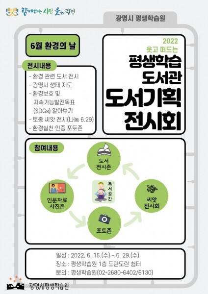이번 전시회에서는 기후변화의 심리학, 쓰레기 제로 대작전 등 어린이 도서를 포함한 40권의 도서를 전시하며 토종 씨앗 전시 환경 보호 카드뉴스 등 인문자료 사진존 지속가능발전목표 알아보기 환경실천 인증 포토존 등 가족과 함께 즐길 수 있는 다양한 행사를 진행 한다.