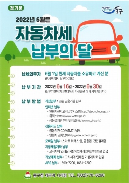 과세 대상은 6월 1일을 기준으로 인천 동구에 등록된 자동차·건설기계 ·125cc초과 이륜차로 납부 기간은 6월 30일까지이며 1월과 3월에 연세액을 일시 납부한 경우에는 6월에 과세되지 않는다.