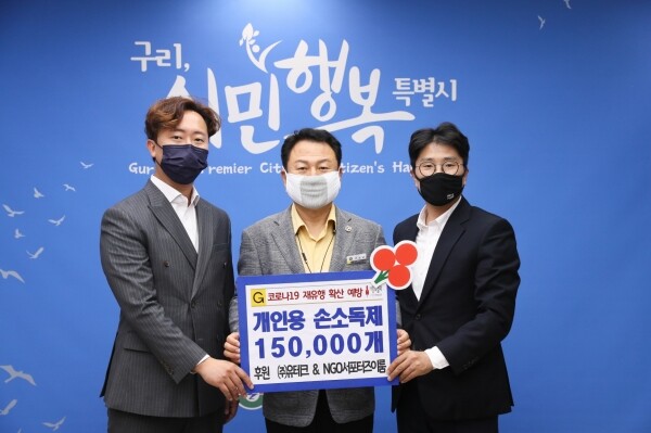 안승남 구리시장은 “꾸준하게 나눔문화를 실천하고 있는 주식회사 유테크 이정태 대표님과 ‘서포터즈 이룸’ 최철 대표님을 비롯한 관계자분들에게 감사드린다”며 “전달해 주신 손소독제는 취약계층 시민들의 개인위생과 건강에 큰 도움이 될 것이다”고 전했다.