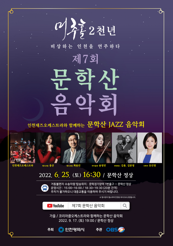 백민숙 시 문화유산과장은 “코로나 이후 2년 만에 문학산 음악회가 산 정상에서 개최되는 만큼 ‘JAZZ 음악회’에 더 많은 준비와 노력을 기울였다”며 “전국 유일의 산상 클래식 음악회인 문학산 음악회를 통해 가족과 함께 힐링과 추억을 만드는 시간이 되길 바란다”고 말했다.