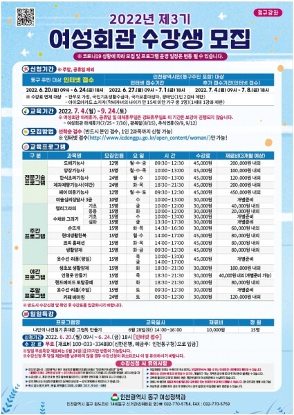 수강생 모집은 동구 주민 우선 접수는 20일부터 24일까지, 동구 주민을 포함한 인천시민 접수는 27일부터 7월 1일까지 인터넷 접수로 진행된다.