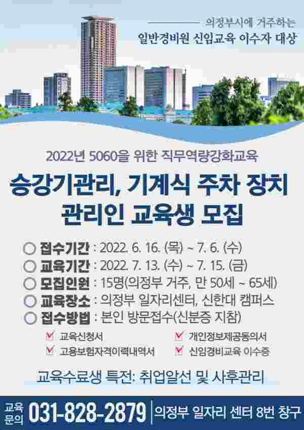 [뉴스써치] 의정부시는 7월 13일부터 7월 15일까지 코로나19로 취업에 어려움을 겪고 있는 5060세대를 위한 맞춤형 취업역량교육으로 승강기관리, 기계식주차장치 관리인 교육을 진행한다고 밝혔다.