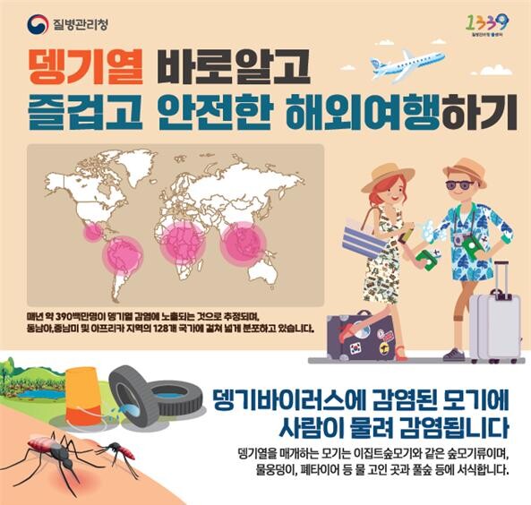 첫째, 여행 전 질병청 누리집을 통해 여행지역별 주의해야 할 감염병 정보 확인, 모기 예방법을 숙지하고 모기 기피 용품 및 상비약을 준비한다.