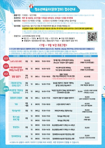 이번 청소년배움터는 청소년들의 건전한 여가와 취미활동의 기회를 제공하고자 영어, 컴퓨터, 드로잉, 캐리커쳐, 칼림바, 기타, 역사, 논술, 방송댄스, 창의로봇 등 11분야 14개 프로그램으로 구성돼 있으며 7월 9일~9월 27일 3개월간 진행된다.
