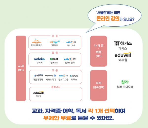 서울런 참여 교육업체가 확대된다.에 따라 7월1일(금)부터 회원이 선택할 수 있는 학습 사이트도 최대 2개에서 3개로 확대된다. 교과 11개 업체 중 1개, 자격증·어학 2개 업체 중 1개를 선택할 수 있으며 독서(윌라) 사이트는 중복으로 선택 가능하다.