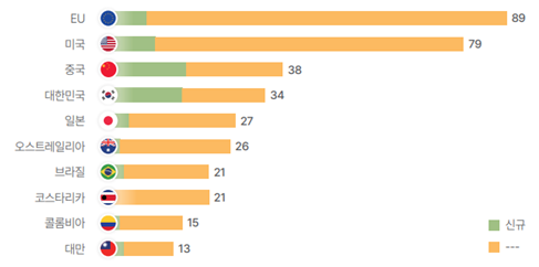 국표원이 발간한 ‘2021 무역기술장벽 연례보고서’에 따르면 세계무역기구 회원국이 발행한 무역기술장벽 통보문은 ‘21년에 3,966건으로 사상 최고치를 기록했다고 밝혔다.