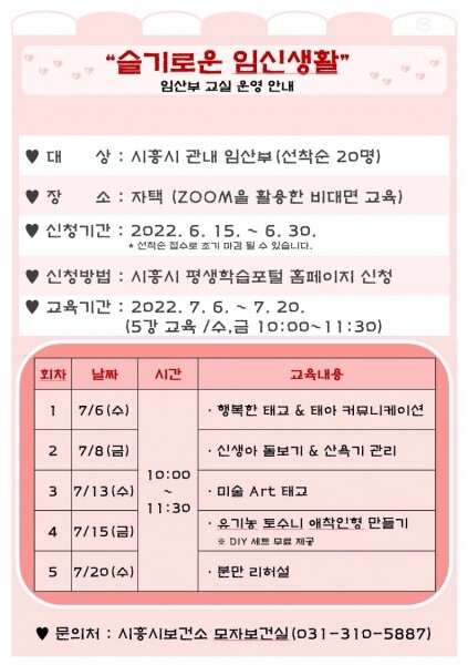 관심 있는 임산부는 6월 15일부터 30일까지 시흥시 평생학습포털 홈페이지를 통해 신청하면 된다.