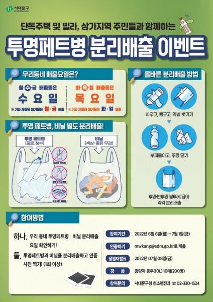 문석진 서대문구청장은 “환경보호와 자원순환 활성화를 위한 이번 분리배출 이벤트에 주택가와 상가 지역에 거주하시는 주민 분들의 많은 참여를 기대한다”고 말했다.