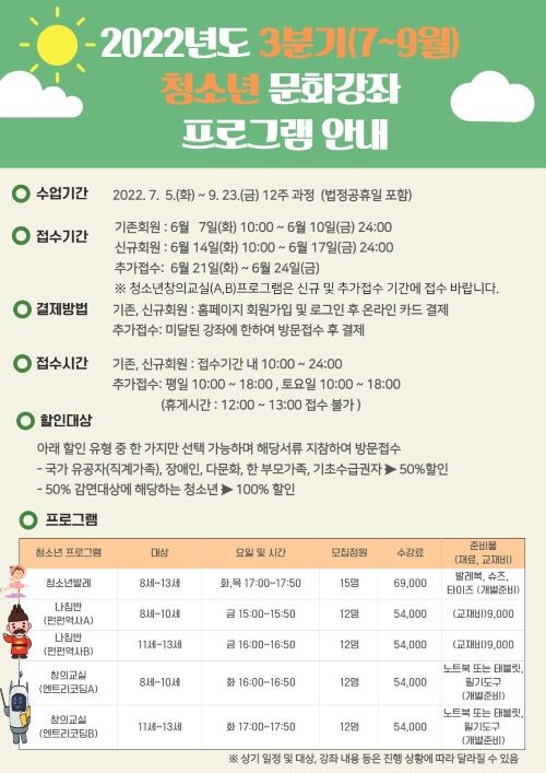 7월 5일부터 개강하는 이번 문화강좌는 관내 8~13세 청소년을 대상으로 균형적인 발달을 위한 발레, 스토리텔링을 통한 역사 속 위인 탐구, 문제해결능력 향상을 위한 엔트리 코딩 등 3개 과정, 5개 강좌에 총 63명을 모집하며 접수방법은 신갈청소년문화의집 홈페이지를 통해 선착순 온라인 접수 및 결제로 진행된다.