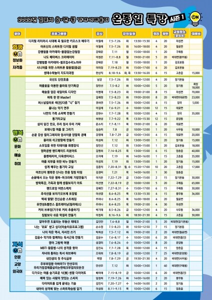 온종일 특강은 지식ON, 희망ON, 행복ON의 주제에 맞춘 다양한 분야의 강좌를 대면·비대면 및 야간 시간대까지 많은 시민들이 접할 수 있도록 진행된다.