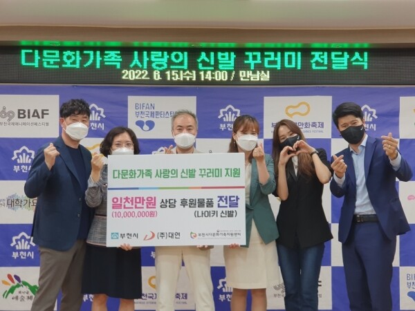 또한 윤태선 다문화가족지원센터 운영위원장은 “수년간 부천에서 지속적인 나눔활동을 실천해온 ㈜ 대연 대표님을 비롯한 직원 여러분께 감사드린다”며 “새 신발을 신고 다문화가족 아동들이 건강하게 성장하였으면 좋겠다”고 전했다.