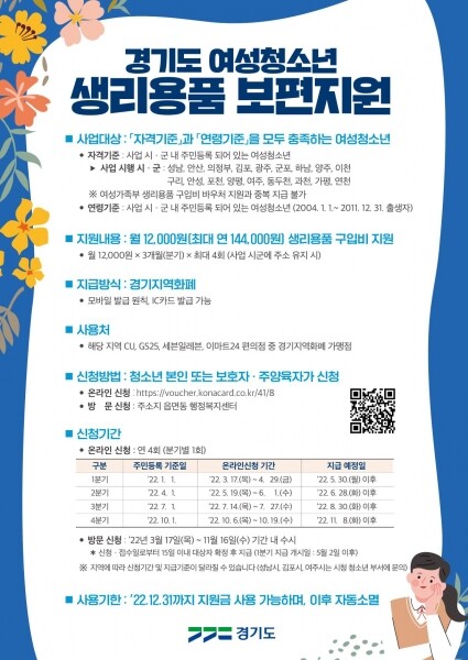 해당 지원금은 연말까지 사용할 수 있으며 경기지역화폐 가맹점인 편의점에서 생리용품을 구입에만 사용할 수 있다.