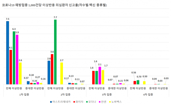 4차 접종 4,257,743건 중 이상반응은 2,420건이 신고됐고 이 중 일반 이상반응은 2,269건, 중대한 이상반응은 151건이었다.